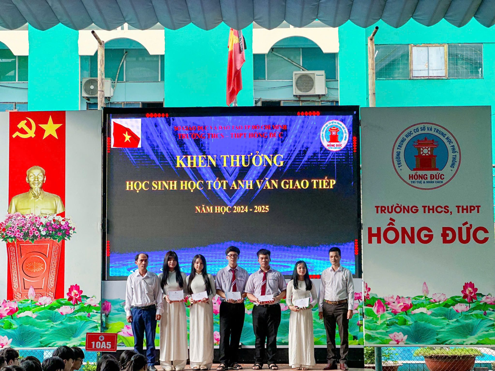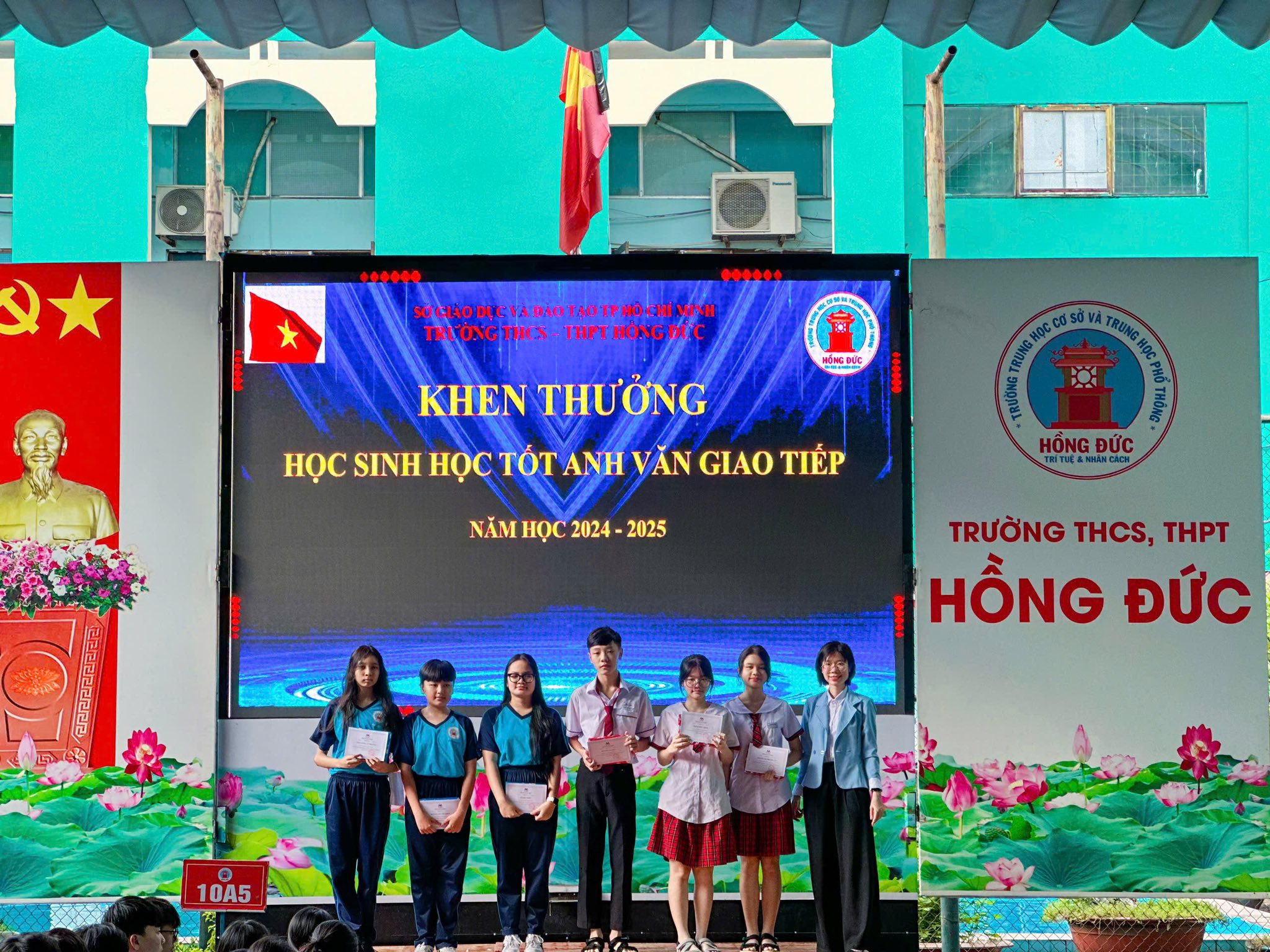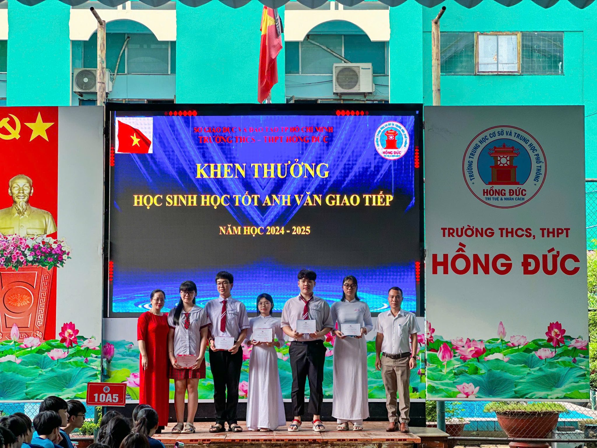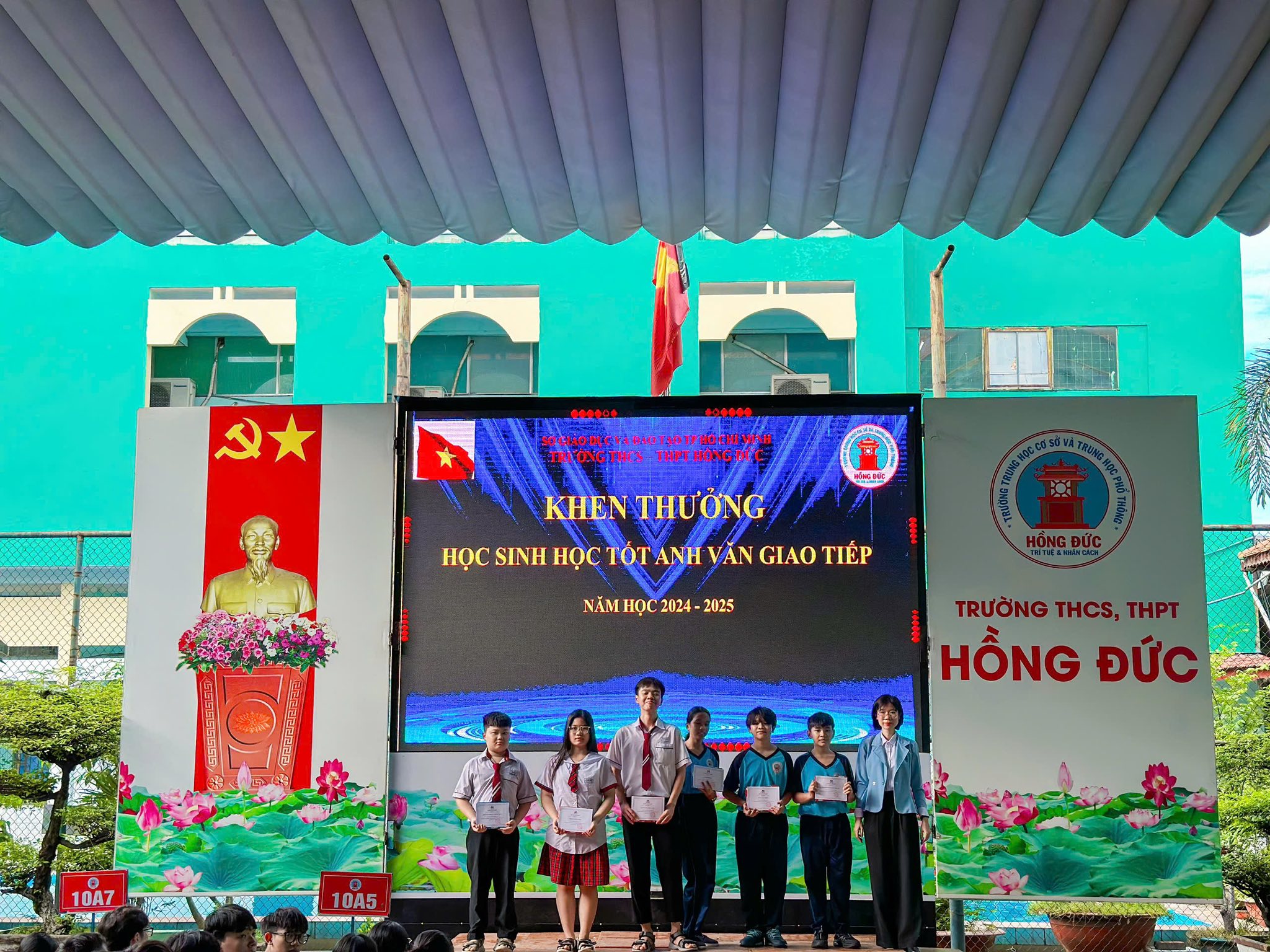 Đặc biệt, trong khuôn khổ buổi sơ kết, Nhà trường đã khen thưởng các em học sinh có thành tích nổi bật trong môn Tiếng Anh giao tiếp, những gương mặt tiêu biểu đã không chỉ đạt điểm cao mà còn tự tin thể hiện khả năng giao tiếp tiếng Anh trong các hoạt động học tập, sinh hoạt CLB, và giao lưu quốc tế.